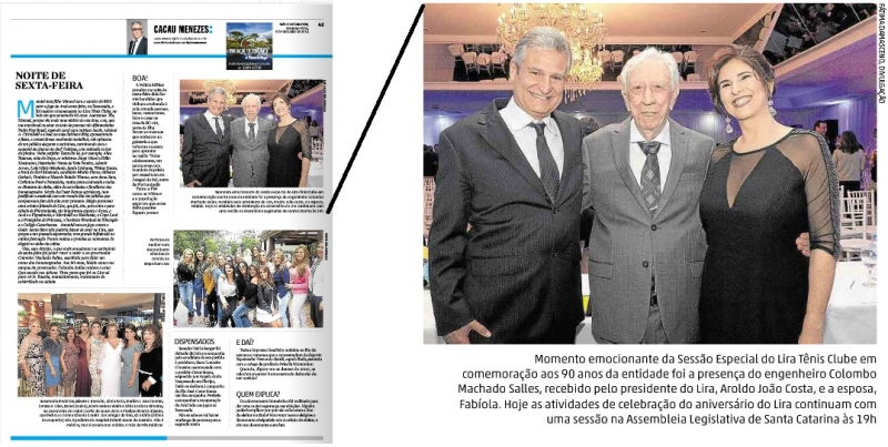 III- O evento teve, também, a cerimônia de lançamento e obliteração, com carimbo, do selo personalizado, que registra os 90 anos do Lira Tênis Clube, pela empresa Brasileira de Correios e Telégrafos. O selo personalizado ressalta a importância do Clube, como patrimônio cultural catarinense.
