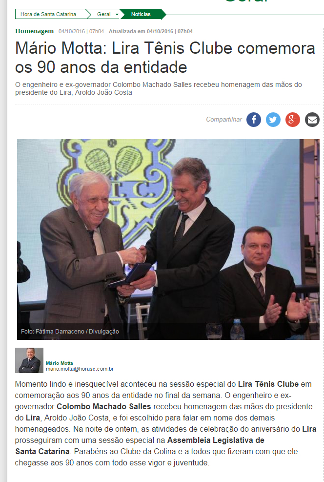 Quero, mediante este meio, agradecer de forma superlativa a tão generosa lembrança de V. Sa. e da instituição que tão bem preside, ao incluir meu nome no distinto rol dos catarinenses homenageados por ocasião dos históricos 90 anos do Clube da Colina, patrimônio cultural de Santa Catarina.