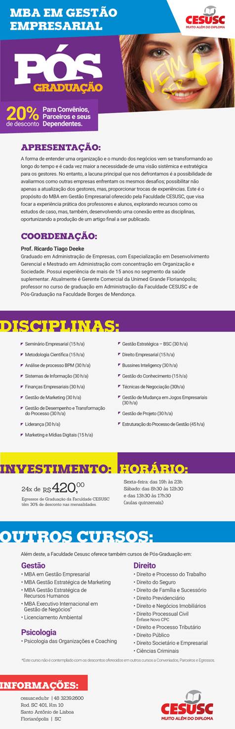 O Lira Tênis Clube, em parceria com o Cesusc, oferece aos associados e funcionários descontos de 20% nos cursos de MBA em Gestão Empresarial e Pós-Graduação em Psicologia das Organizações e Coaching.