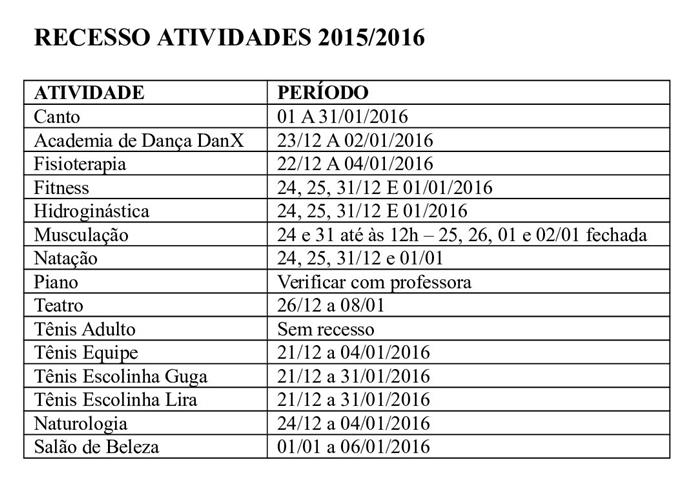 Por solicitação dos associados, a Diretoria do Lira Tênis Clube, informa o horário de verão das atividades dos Setores de Natação e Tênis no período de 18/12/2015a28/02/2016.