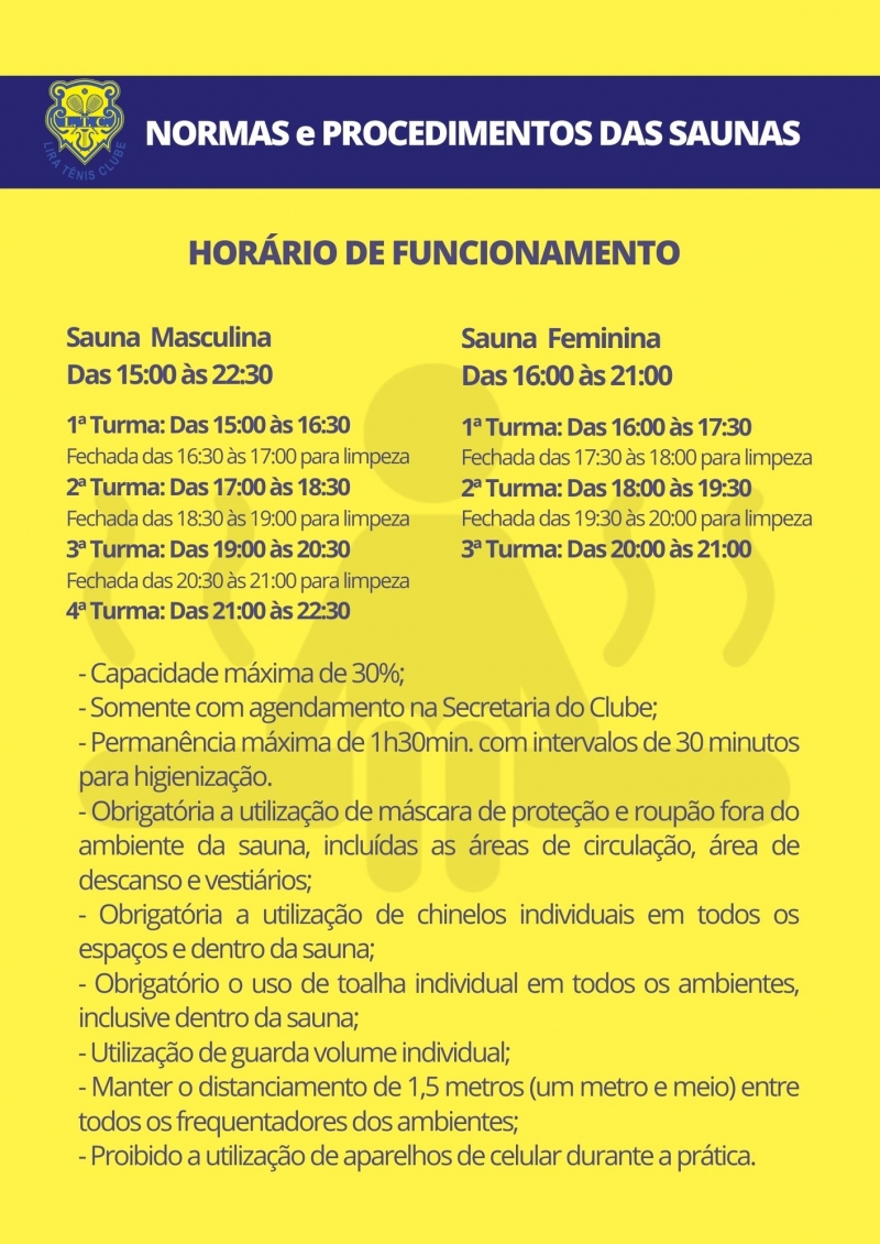 A Prefeitura de Florianópolis e a Vigilância Sanitária liberaram o uso das Saunas, seguindo as normas e procedimentos, conforme abaixo: