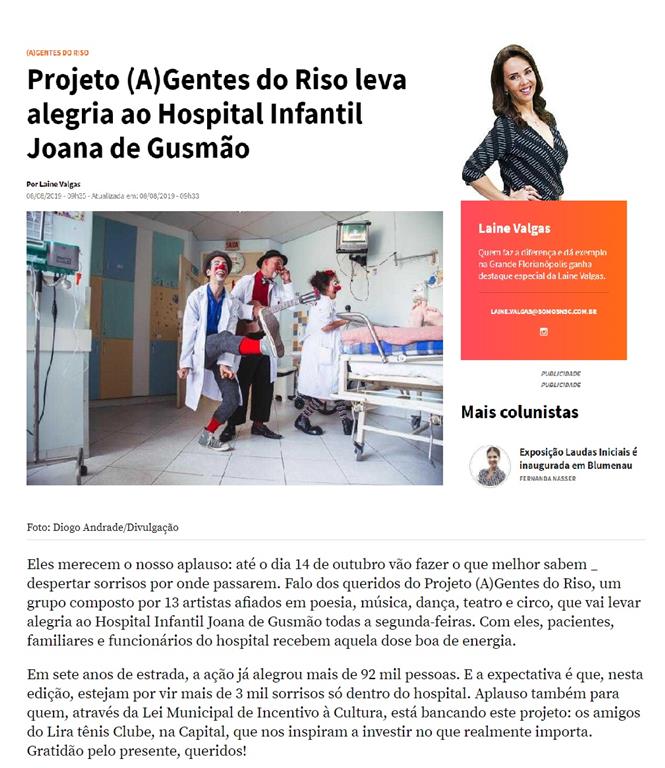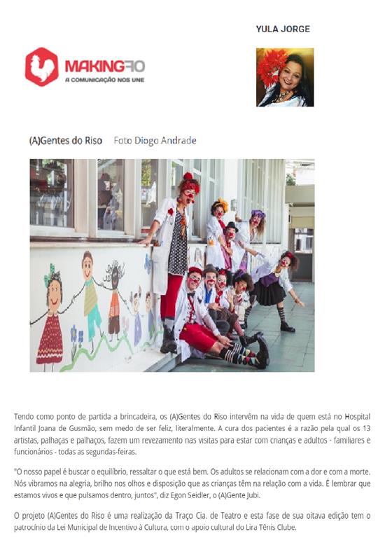 O Projeto está em sua oitava edição, tendo como ponto de partida a brincadeira, os (A)Gentes do Riso intervêm na vida de quem está no Hospital Infantil Joana de Gusmão. A cura dos pacientes é a razão pela qual os 13 artistas, palhaças e palhaços, fazem um revezamento nas visitas para estar com crianças e adultos – familiares e funcionários – todas as segundas-feiras.